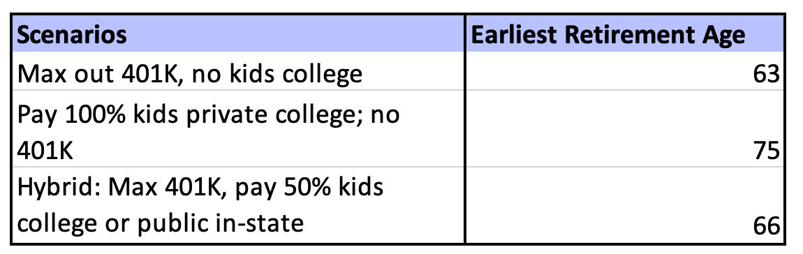 Recommended: The hybrid approach that prioritizes retirement but also help put kids through publoic in-state college without tuition or alternatively, pays for 50% of private college.